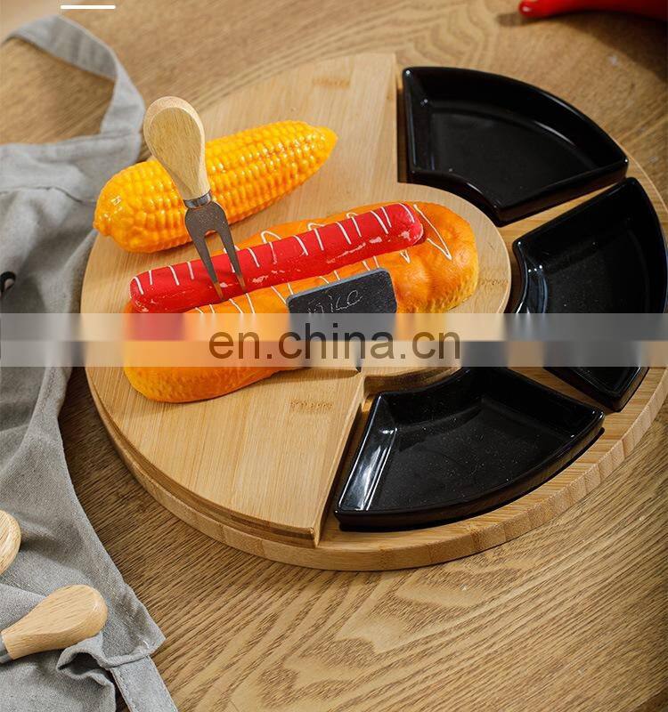 Home > Products > Chopping blocks > Round Shape Home Kitchen Tableware Bamboo Cheese Board With Three Ceramic Bowl And Cutlery Set Kitchen Chopping Blocks