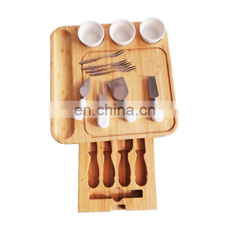 Wholesale High Quality Organic Charcuterie Cutting Bamboo Cheese Board And Slide Out Drawer Knife Cutlery Set