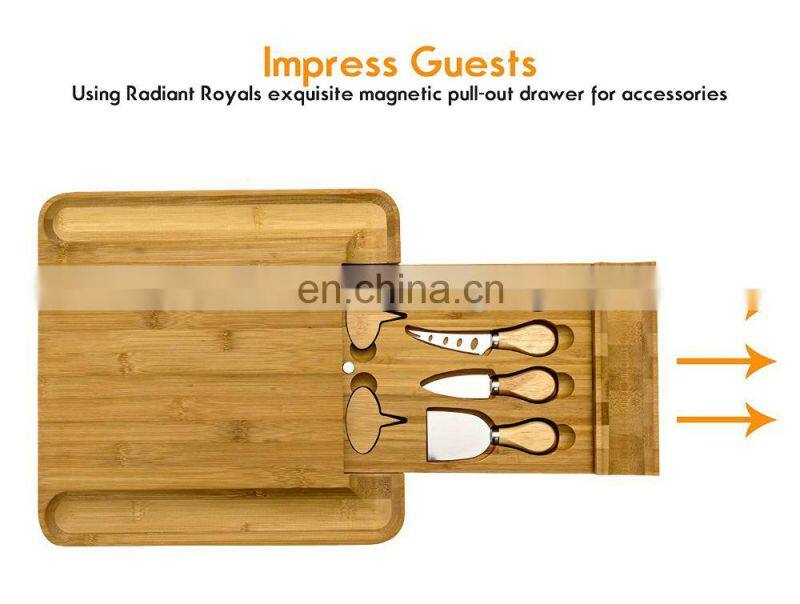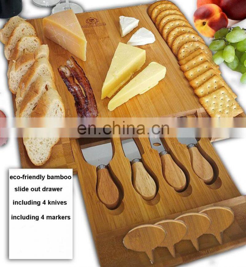 Wholesale 100% Biodegradable Natural Large Tray Bamboo Cheese Board With Knives Slide Out Drawer