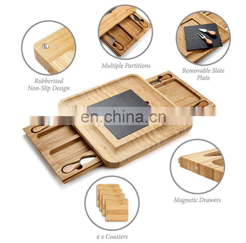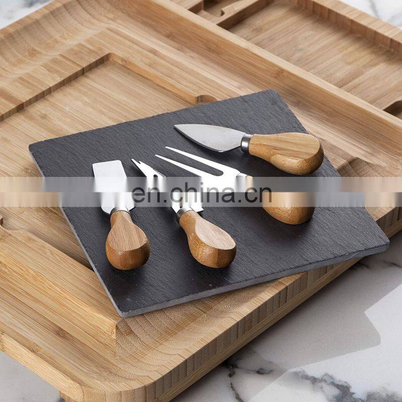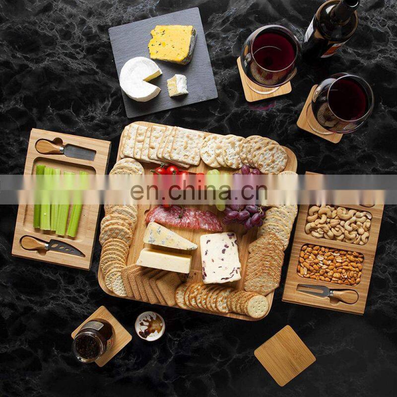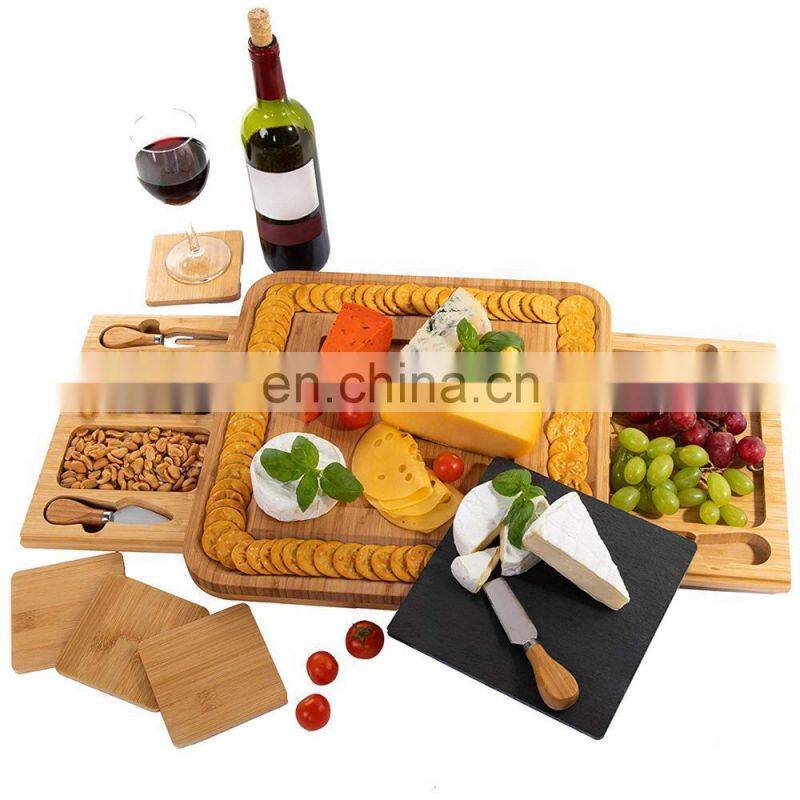 Wholesale 100% Biodegradable Natural Large Tray Bamboo Cheese Board With Knives Slide Out Drawer
