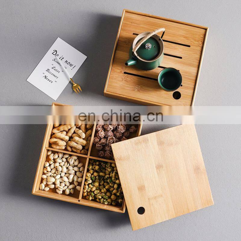 Elegant Design Square Bamboo Snack Serving Tray 4 Compartments Dried Fruit Storage Box With Bamboo Lid Pantry Organizer