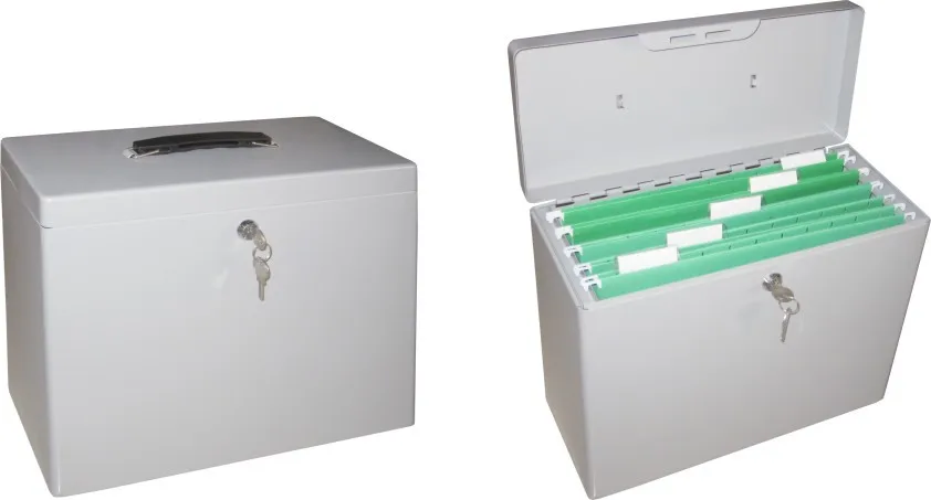 The steel file box keeps your files secure, and allows you to store all your hanging files in one portable place. The file box includes a key lock with two keys. For convenience, the box includes a carry handle.
