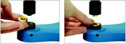 Place the material between the grommet dies(1,2) and align the desired location of the grommet with the piercing shaft of the male grommet