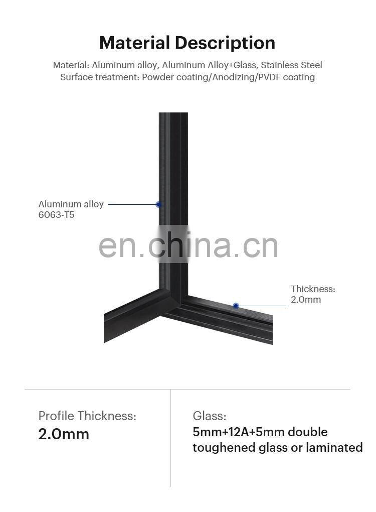 | Features | 1. This main profile thickness is 2.0mm ; 2. Glass is double glass, 6+ l2A+6MM is available; 3. Germany hardware & Chinese brand; 4.Hardware are available, with three points lock; 5. Gasket is EPDM gasket. |