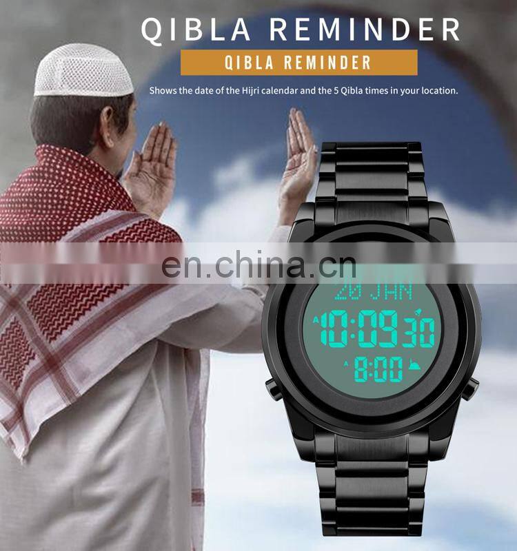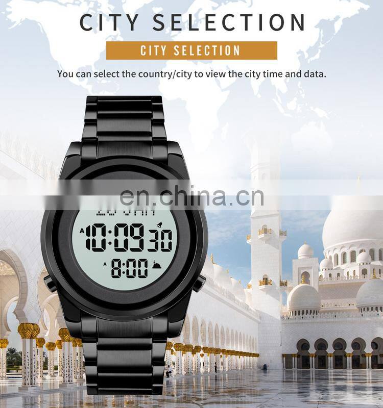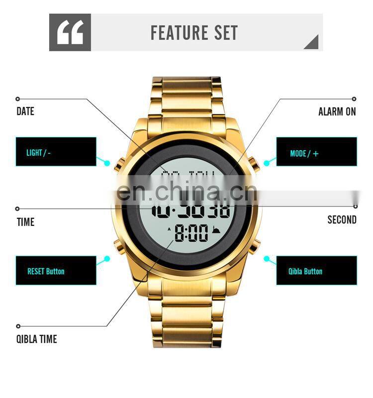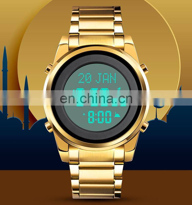 New Arrival Skmei 1763 Islamic Watch Muslim Prayer Time Watch Gold Stainless Steel Strap for Men
