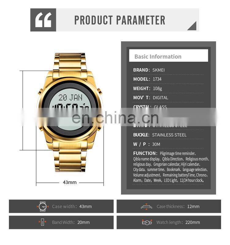 Home > Products > Special Function Watch > 1734 Muslim Prayer Watch Reloj Waterproof Watches Stainless Steel Skmei Mujer