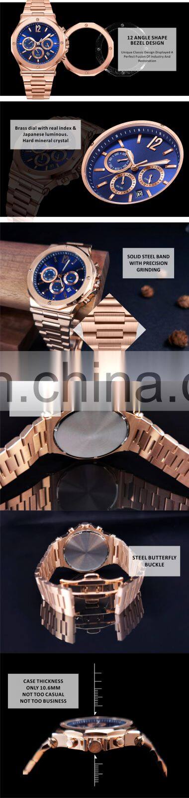 High Quality Customized Classic Multifunction Men Steel Wristwatch Collection Luxury Male Gold Watch