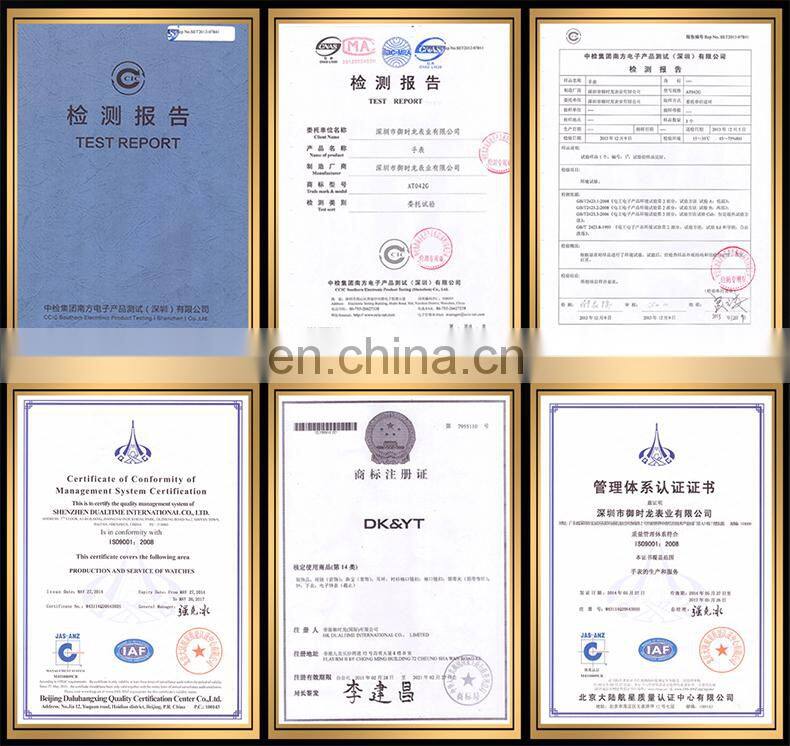 HK Dualtime watch industry Co., Ltd is a watch manufacturer build up in 2006 and passes through the certification of ISO9001. The factory area is 1400 square meters, and the annual yield is 500000pcs watches. The company owns a professional research & development team. We can do 300 meter waterproof with good quality. There are more than 2000 watch styles and more than 500 watch samples available, which include lovers series, lady series, sports series, military watch series, gentleman series, electronic series and gemstone series. Most watches are exported to Europe, America, and Southeast Asia.