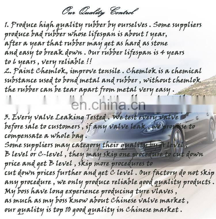 Some suppliers may category their quality by A level , B level or C-level , they may skip one procedure to cut down price and get B level , skip more procedures to cut down prices further and get C level . Our factory do not skip any procedure , we only produce reliable good quality products . My boss have long experience producing tyre vlaves , as much as my boss know about Chinese valve market , our quality is top 10 good quality in Chinese market .