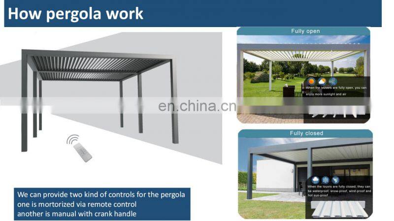 We can custom any sizes for the aluminum pergola and you can choose motorized and manual control way.