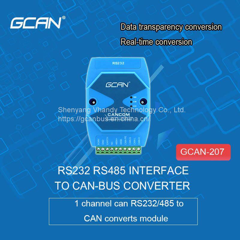 Packaging & DeliverySelling Units:Single itemSingle package size: 26X16X6 cmSingle gross weight:0.500 kgPackage Type:Export cartonLead Time:Quantity(sets) 1 - 500 >500 Est. Time(days) 7 To be negotiated The GCAN-207 converter has integrated one standard CAN-Bus interface, one serial-Bus interface (RS232 or RS485). GCAN-207