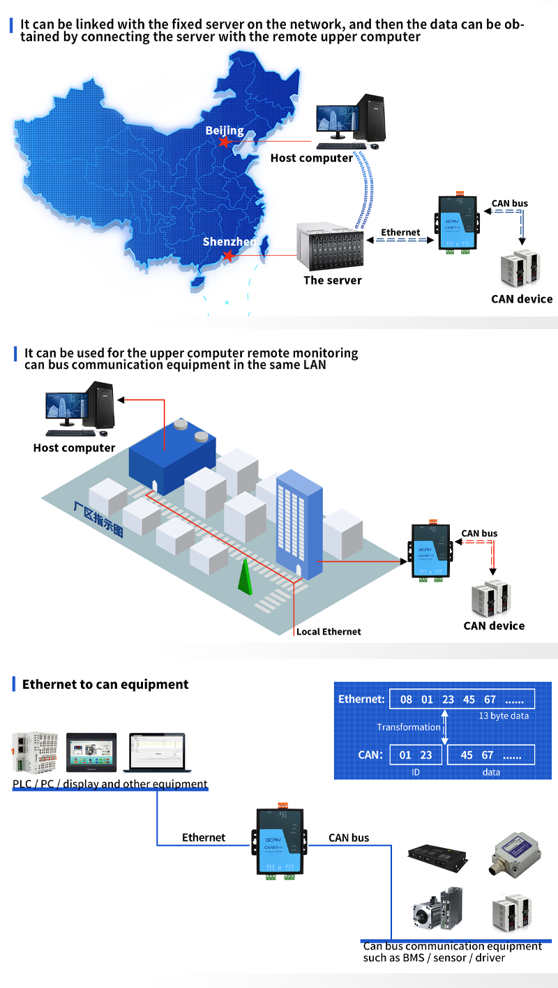 - TCP Server ModeGCAN-212 waits for TCP Client to connect. If connection succeeds, can make bidirectional data communication.TCP Client ModeGCAN-212 starts connection to TCP Server, if connection fails, TCP client will try to reconnect till success. If connection succeeds, can make bidirectional data communication.UDP ModeUDP mode is a communication mode without connection, makes the data communication through UDP protocol.Applications