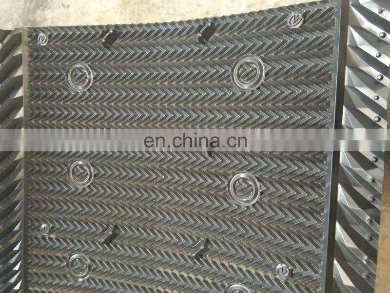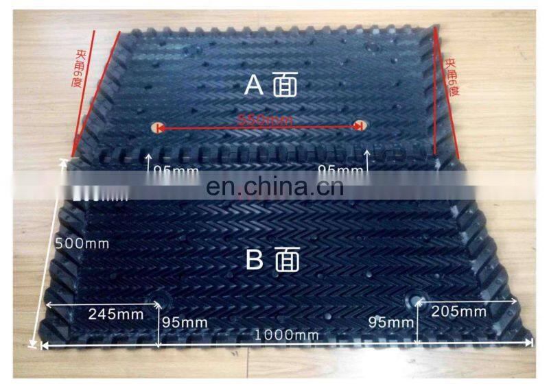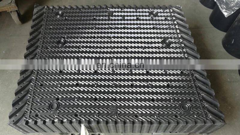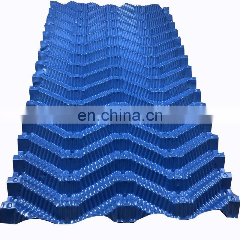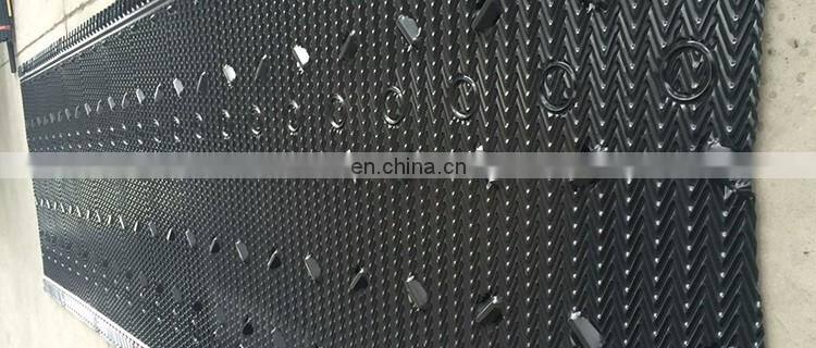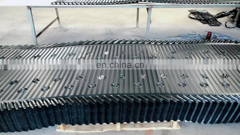 High quality Anti UV Non-defrmation MX75 cooling tower fill Marley infill Cross flow cooling tower fill make the water meet th air crossly, when cooling tower air entry the tower from two sides , the hot water come into the tower from top, this meeting between hot water and cooling air was named cross flow, the result is the water become the lower temperature and flow away from the tower bottom, and the hot air is uprising in the tower top