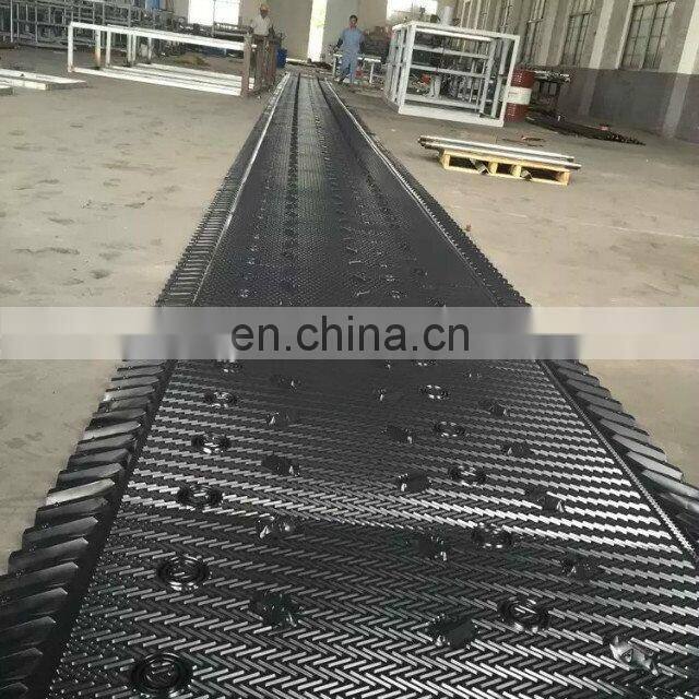 High quality Anti UV Non-defrmation MX75 cooling tower fill Marley infill Cross flow cooling tower fill make the water meet th air crossly, when cooling tower air entry the tower from two sides , the hot water come into the tower from top, this meeting between hot water and cooling air was named cross flow, the result is the water become the lower temperature and flow away from the tower bottom, and the hot air is uprising in the tower top