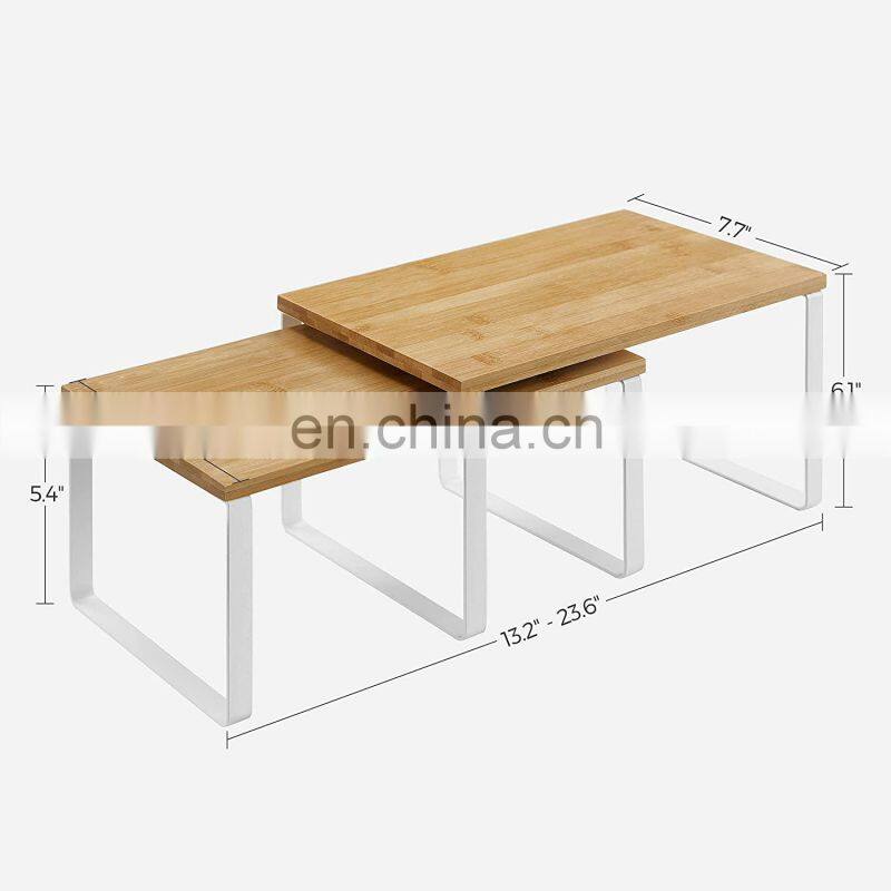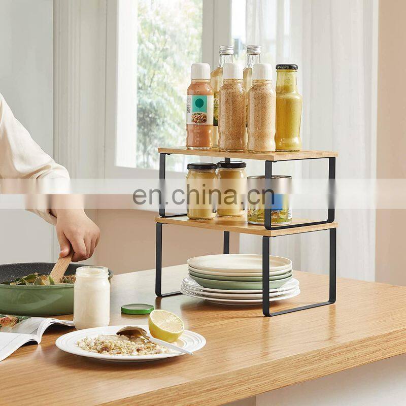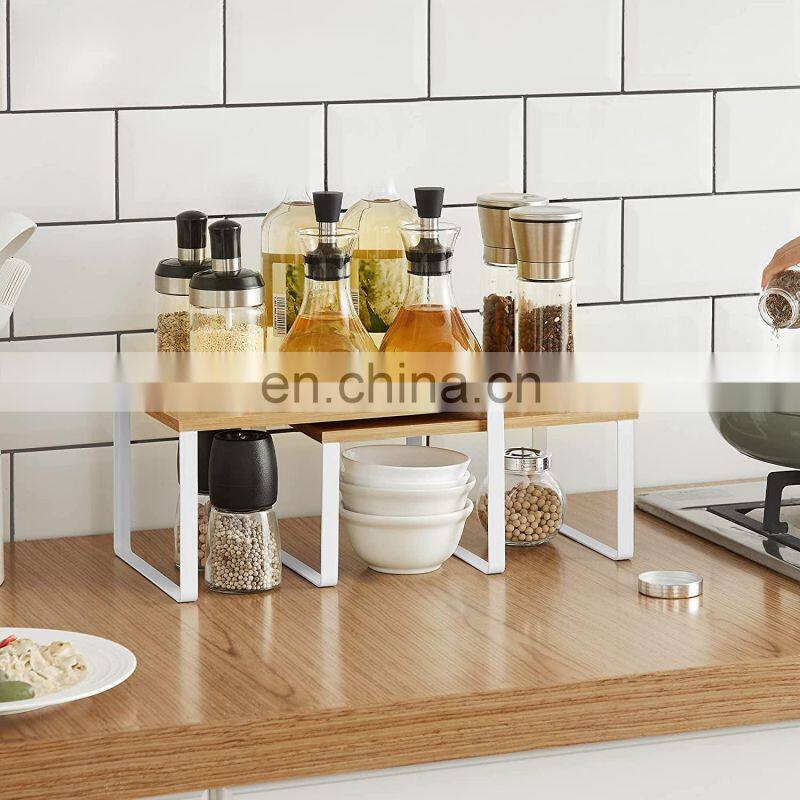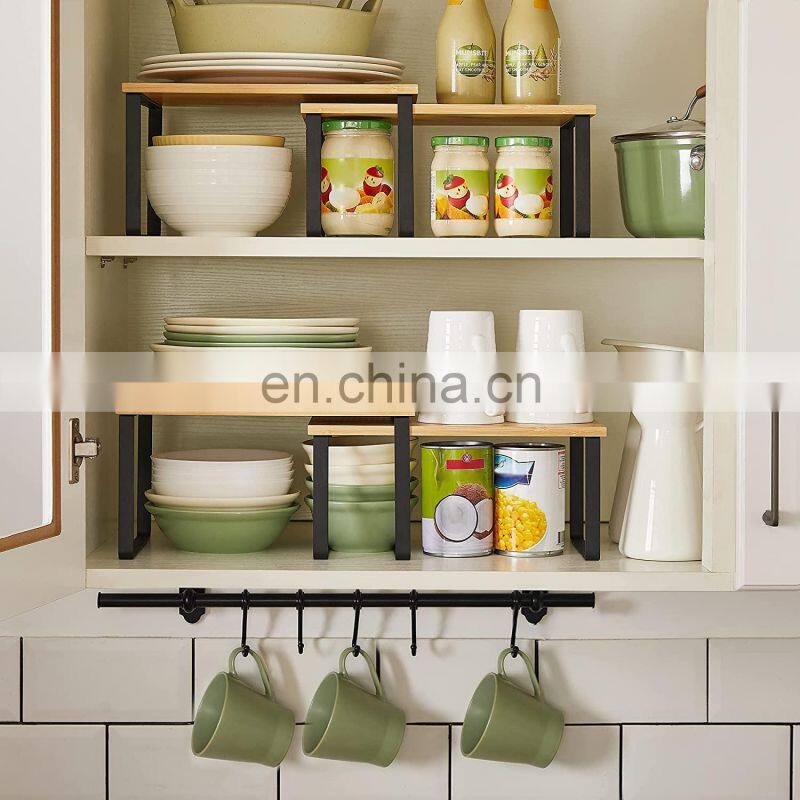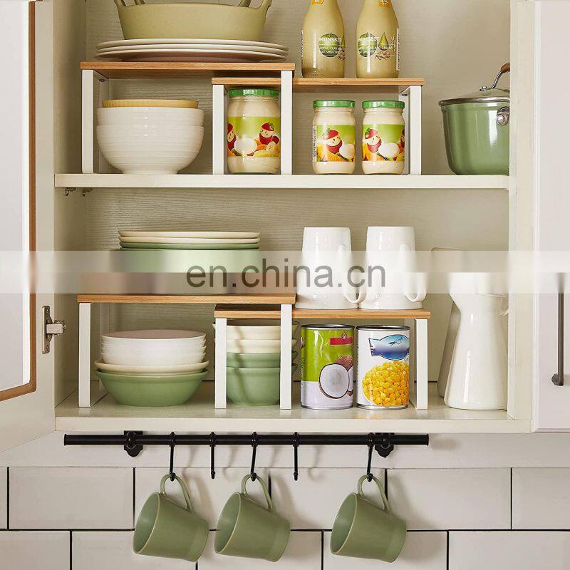 Cabinet Shelf Organizers, Set of 2 Kitchen Counter Shelves, Stackable, Expandable, Metal and Bamboo