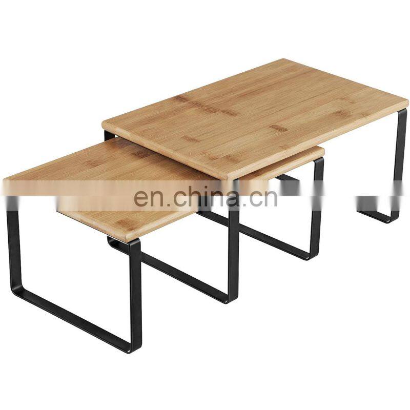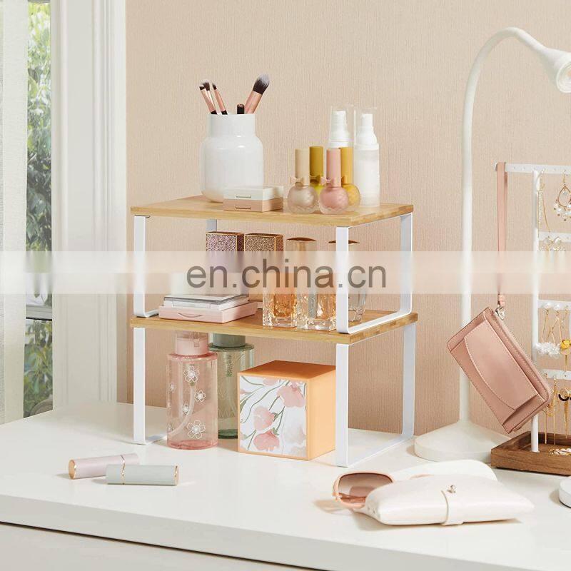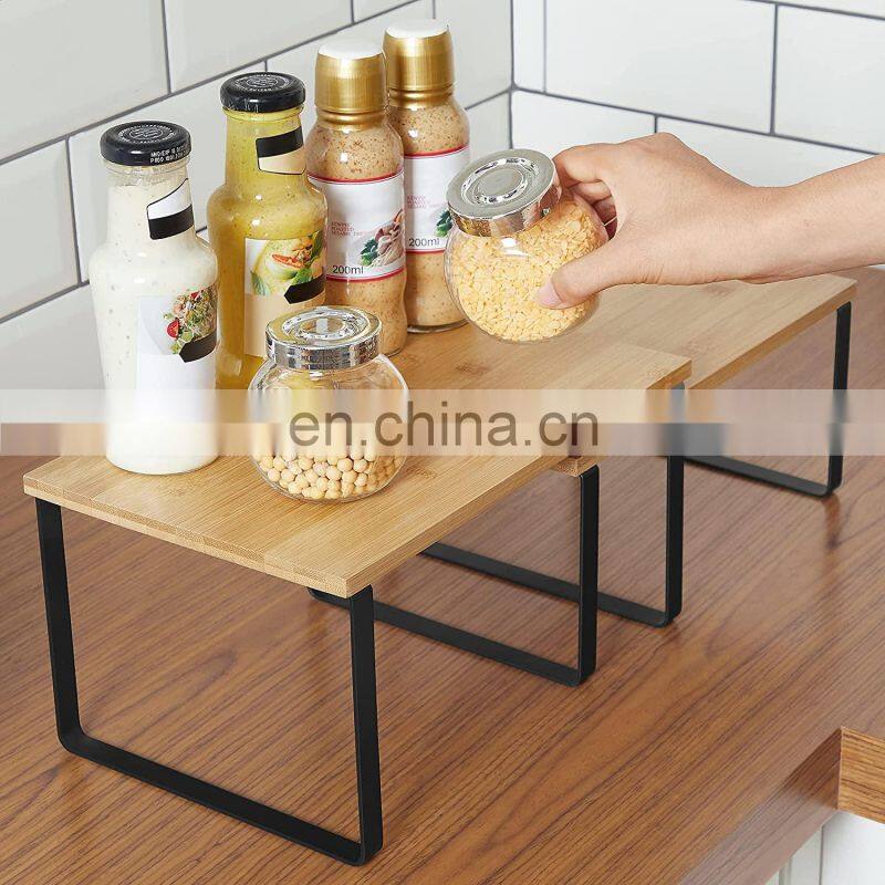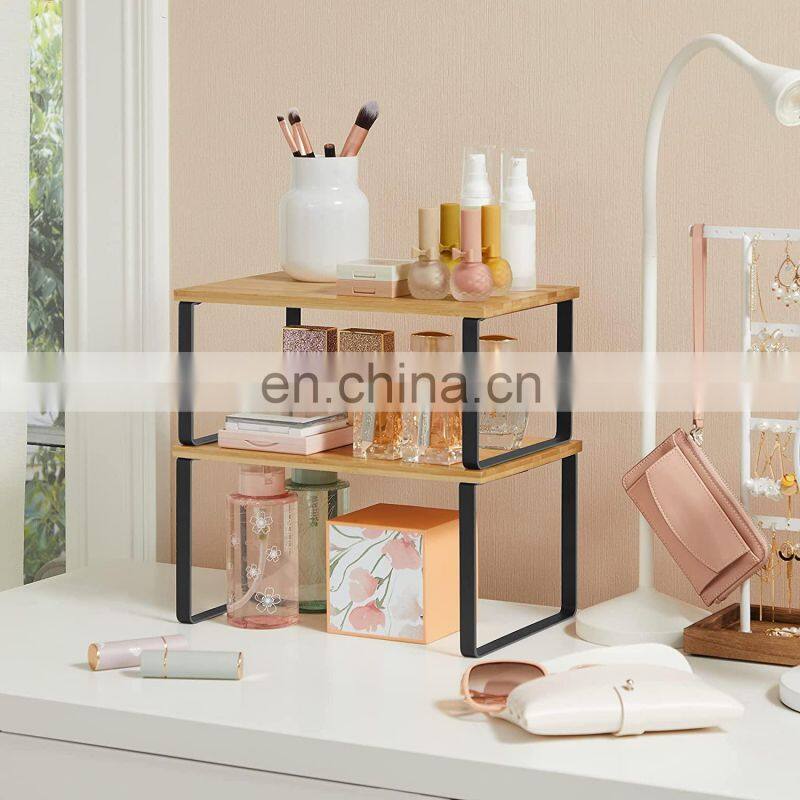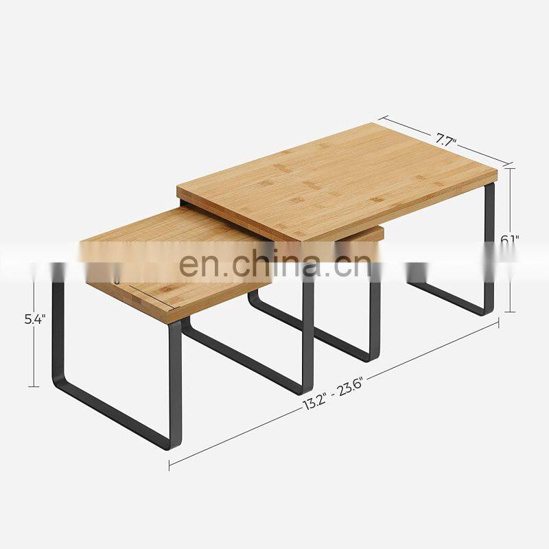 Cabinet Shelf Organizers, Set of 2 Kitchen Counter Shelves, Stackable, Expandable, Metal and Bamboo