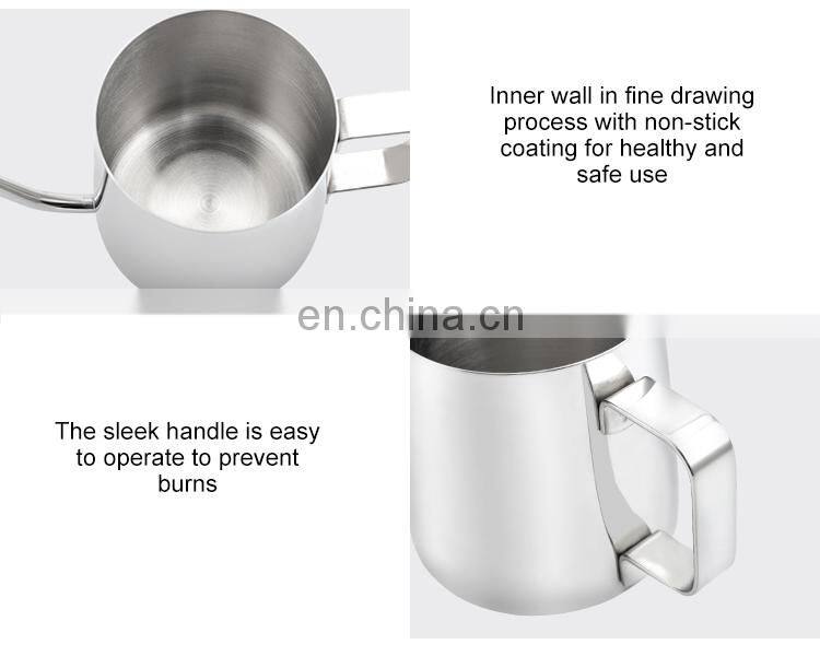 Feature | 1. Made of 304 stainless steel of seamless integration, strong and durable 2. Fine and slender gooseneck sprout with continuous,convergent and stable water flow 3. Inner wall in fine drawing process with non-stick coating for healthy and safe use and for easy washing 4. Ergonomically designed handle for comfortable holding and no heat |