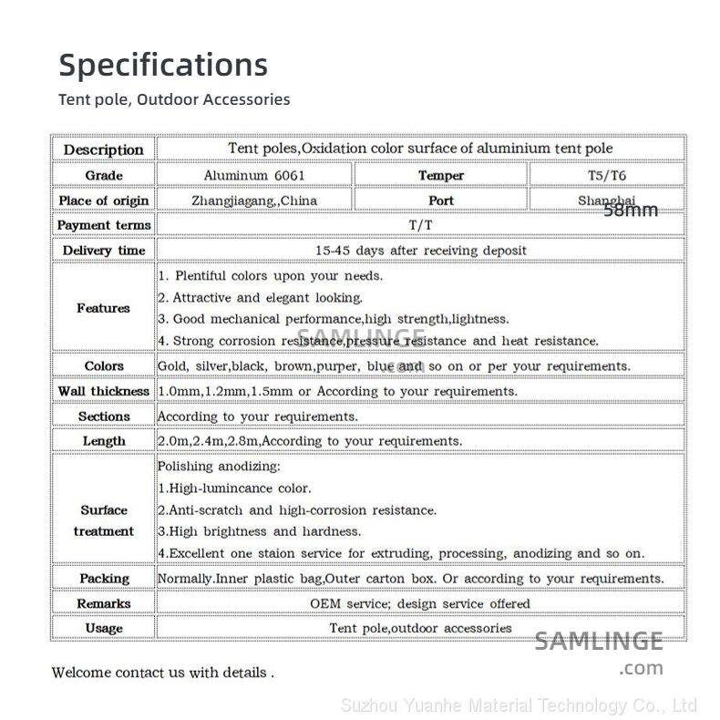 | Surface Treatment | Anodized | Usage | tent pole,outdoor accessories; tube for camping,tent tube,outdoor gears | |
