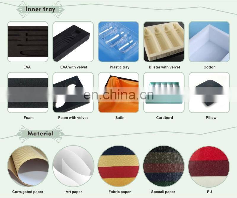 Boxes Accessory | VAC tray, Ribbon, PVC or PET tray, EVA, Sponge, Velvet, Cardboard or Flocking inserts. | |