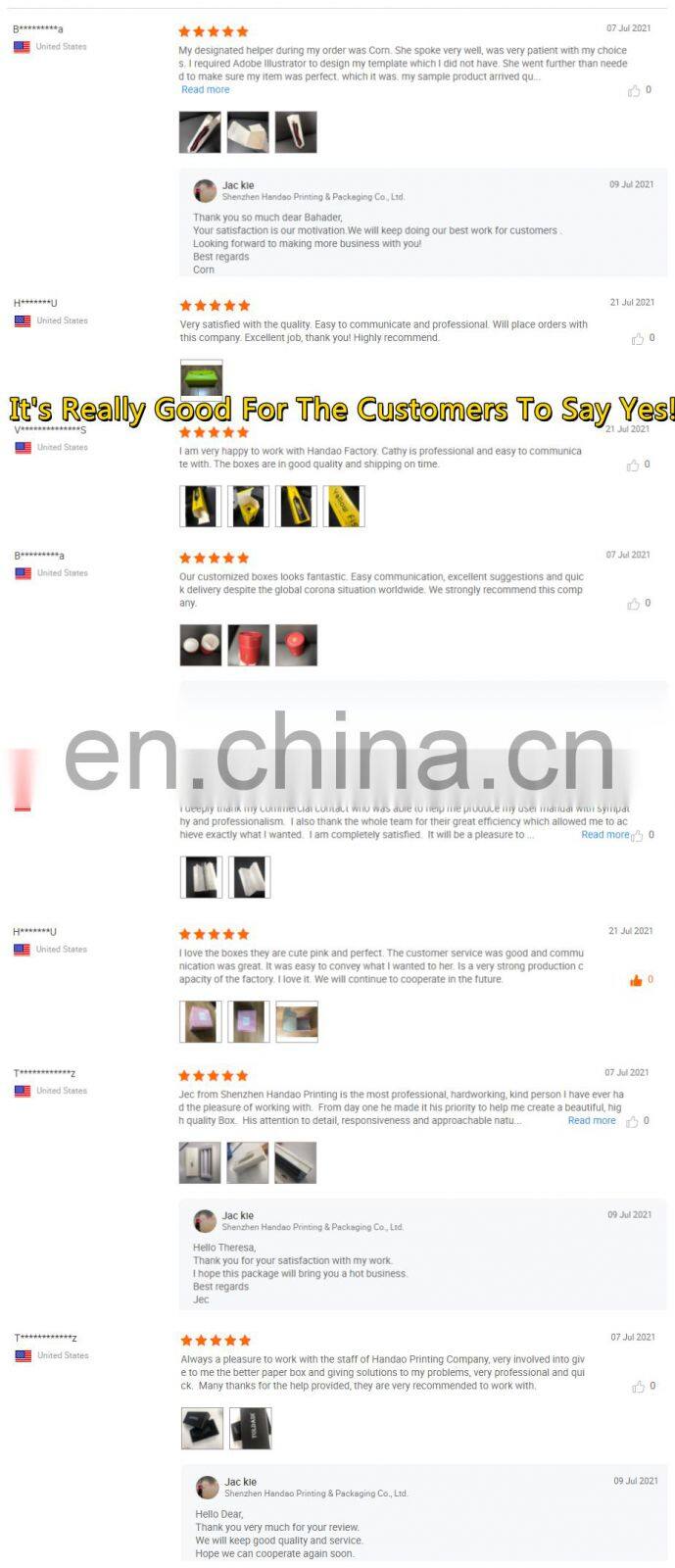 Shenzhen handao printing and packaging Co., Ltd. is a company engaged in high-quality paper products packaging. Such as food packaging, cosmetics packaging, luxury packaging, flower packaging, electronic packaging and so on, our factory has produced thousands of styles of paper packaging products. After 15 years of development, our factory has a professional production team, design team, service team. Covering an area of 3000 square meters, there are 150 people, equipped with a full set of printing and post press processing equipment imported from Germany. Such as Heidelberg four-color printing press, Heidelberg five color printing press, Heidelberg six color printing press etc...