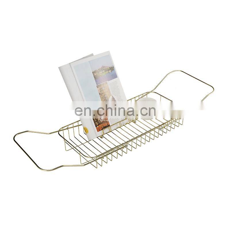 Home > Products > Shower Caddy > Luxury Golden Iron Wire Folding Bathroom Shelf Bathtub Tray Shower Expandable Bathtub Caddy Towel Wine Book Holder Bathtub Rack