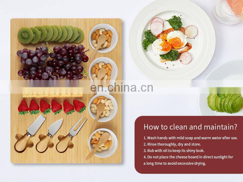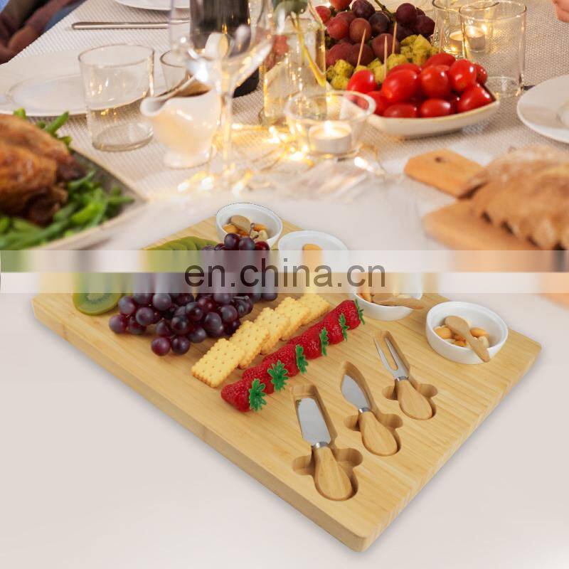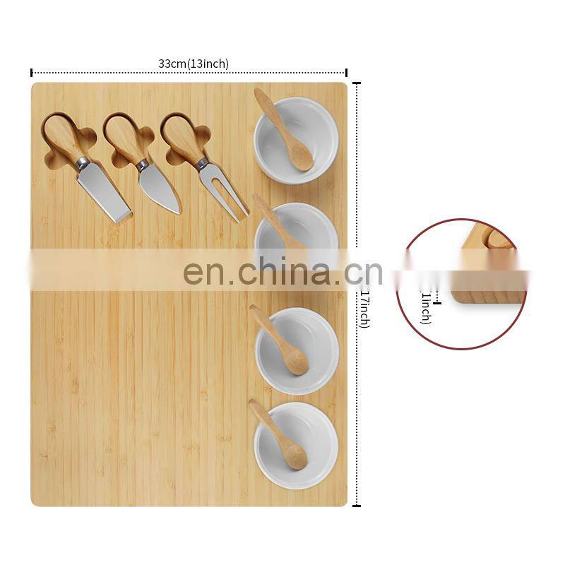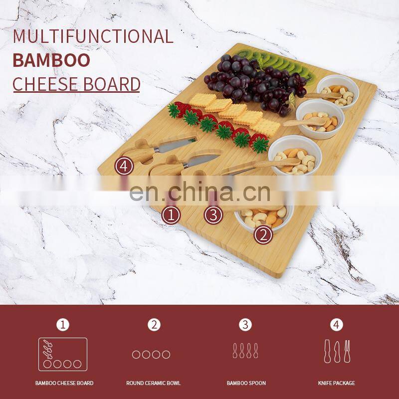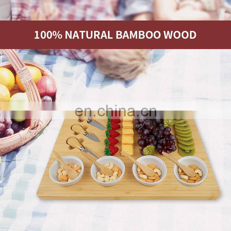 Bamboo Wood Cheese Board Set With Cheese Knife Drawer Ceramic Bowls Serving Forks