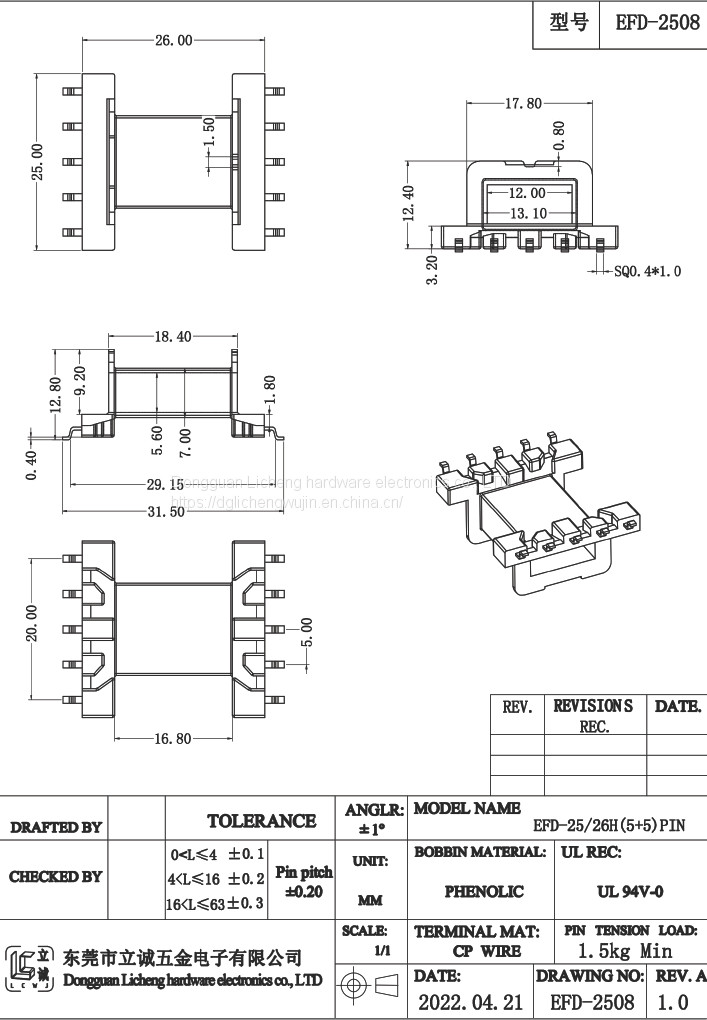 EFD25 SMD Transformer Bobbins (5+5P),EFD25 Transformer Accessories,PM9630 Material With Good High Temperature Resistance.