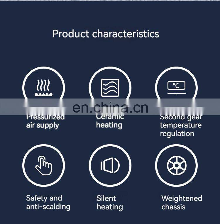 1. Aluminum alloy air outlet; PTC heating element heating; silent AC motor; high temperature resistant, high strength ABS material.