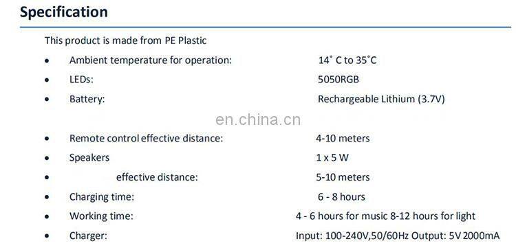 4).Working hrs:8-15hrs for light color change / 4-6hrs for music