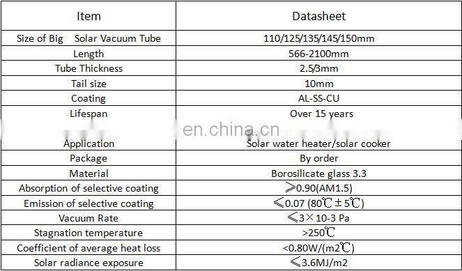 The big size solar vacuum tube is widely used in solar cooker,tank less solar collector and so on.