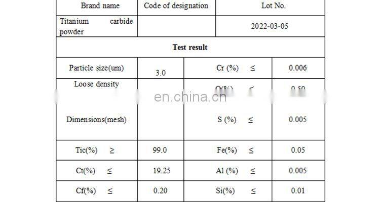 Titanium carbide powder | 1.5um/2.5um/ 3.0um/45-150um or customized | TiC :98.80 | powder | TiC :98.80% Total carbon:19.15% Free carbon:0.23% S:0.005% N:0.45% Cr:0.006% O:0.45% Fe:0.05% Al:0.005% Si:0.01% | |||||