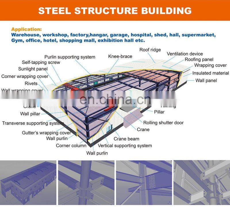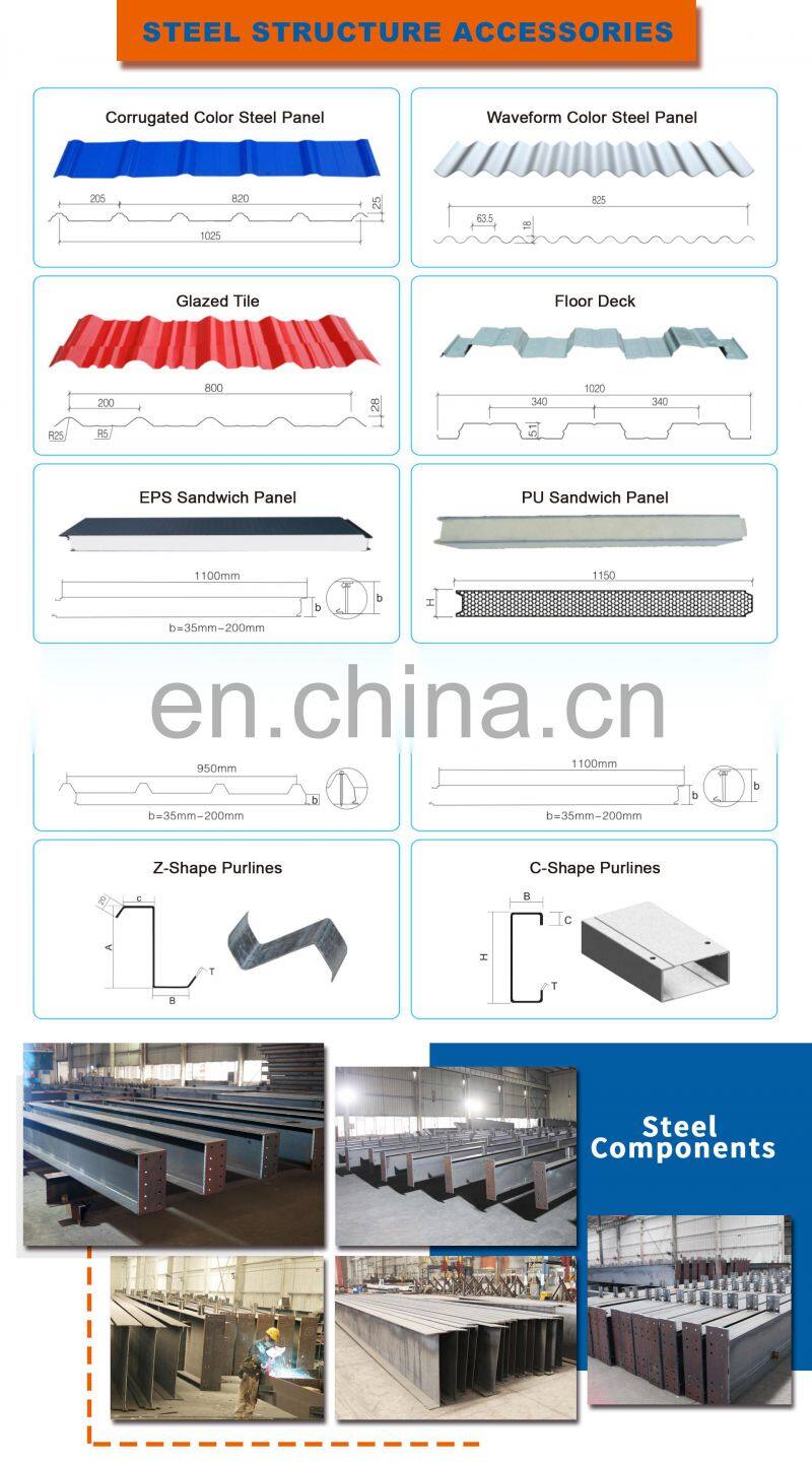 Steel structure building is made of heavy steel frame and cladding panels, doors and windows etc. Main Column and rafter are welded H -steel, purlin is steel with galvanization 275g/m2, can be C or Z section. Secondary steel components are L- steel, CHS, SHS, RHS, round steel rod, etc. Most of the steel componnets are connected by bolts.