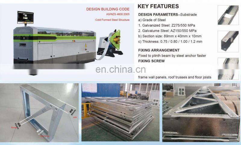 Material | Grade of Steel: G550 Double sides Galvanized steel: Z275 Section size: 89mm*41mm*11mm Thickness: 0.8~1.0mm ( for length above 9m: thickness 1.2 mm) Framing system Cold formed galvanized frame wall panels, roof trusses Fixing arrangement: fixed to plinth beam by steel anchor faster Fixing screw, expansion anchor bolts, rivets, silicone sealings, corrugated electricity roller door , Small door etc. |