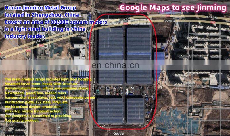 Henan Jinming Metal Group, located in Zhengzhou, China, covers an area of 80,000 square meters, and is a leader in China's light steel construction industry. The company has always put the promotion of green and energy-saving light steel buildings in the first place. The main product range includes light steel houses, steamed bun houses, heavy steel structures, prefabricated houses, office and container stores, newsstands, various color steel plates, foam, rock wool sandwich panels, purification panels, C/Z steel, PU panels , prefabricated guardhouse. We have one-stop supply from design, production and construction. Our company is committed to providing first-class, high-quality products.
