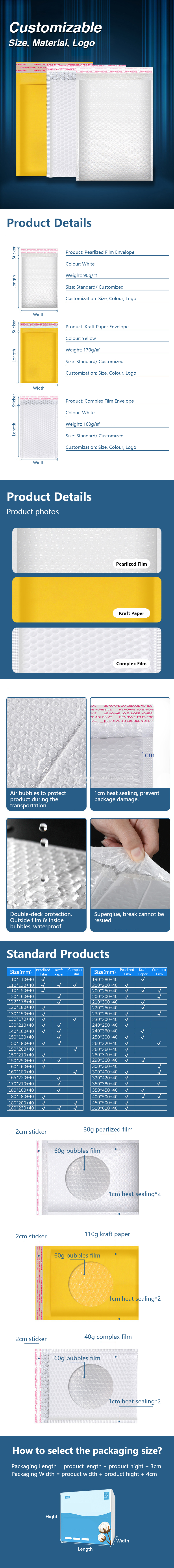 The outer layer is Pearlized / Kraft Paper/ Complex film (color customizable), lined with bubble film.