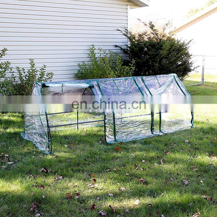 The outer cover of this greenhouse is made of PVC to trap heat to protect delicate plants in bad weather. The door zips open and