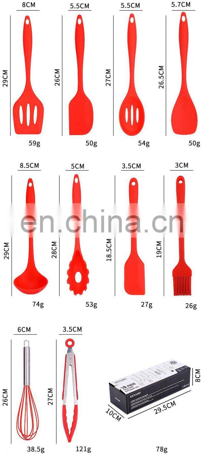 Size & Weight | 1 set = 10 Piece , 750 Grams / set 9 inch Food Tongs 27x 3.5 cm, 121 Grams10 inch Egg-Whisk 26 x 6 cm, 38.5 Grams 8 inch Basting Brush 19 X 3cm,26 Grams 8.4 inch Small Scraper 26.5 X 5.7 cm, 26 Grams 10 inch Big Scraper 26X 5.5 cm, 50 Grams 10.5 inch Slotted Spoon 27 X 5.5 cm, 54 Grams 10.7 inch Noodle Strainer 28X 5 cm, 53Grams 11 inch Butter Spatula 18.5 X 3.5 cm, 27 Grams 11.5 inch Slotted Turner 29X 8 cm, 59 Grams 11 inch Ladle Spoon 29 X 8.5 cm, 74 grams |