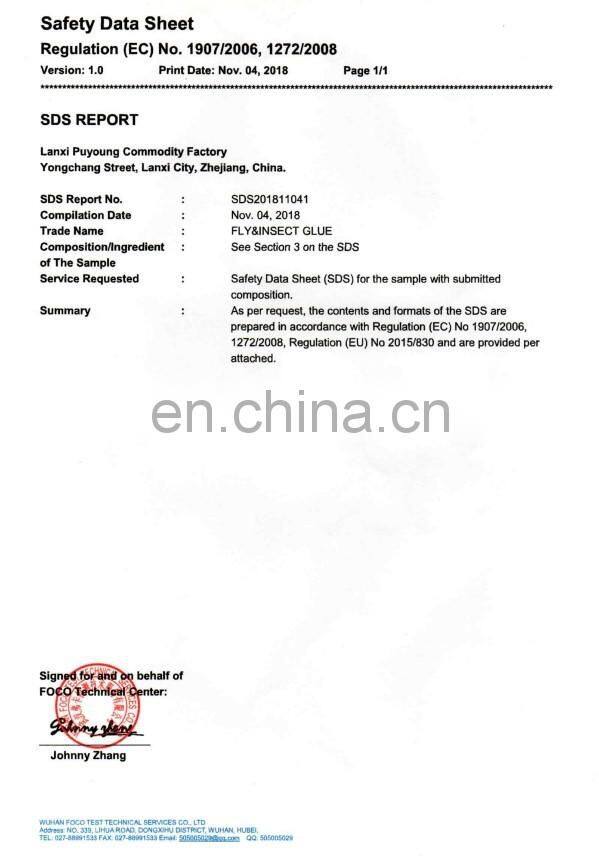 Yiwu Puyoung inport &export Co., Ltd. is located inJinhua City. We are specialized in producing glue of anti-pest and insecticidal powder. We have professional R & D team, who can produce glue according to different requirements from customers. In the case of conform to the order quantity we can also provide customs declaration certificate, and SDS certificates. Our products include mouse glue, insect glue trap, ants / termite / cockroach killing bait, ants snare, kill cockroach gel bait, and insecticidal powder products. Customers can also provide samples or pictures; we will customize according to your requirements, or make a market analysis