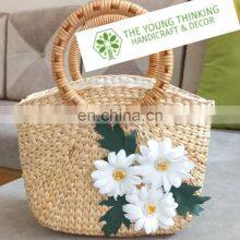 2023 Trendy Water Hyacinth Handbag With Flower, Vintage Style Woven Tote Bag With Rustic Design Wholesale Vietnam Manufacturer