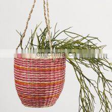 Best Seller Pink Stripe Seagrass Hanging Planter With Lining Straw Planter Storage Basket Plant Holder High Quality