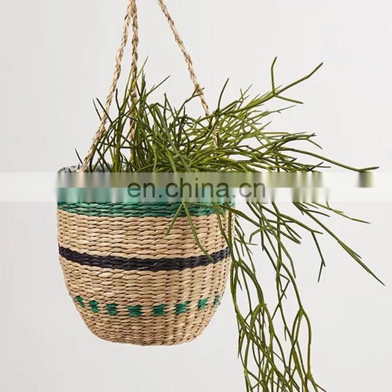 Best Seller Green Stripe Seagrass Hanging Planter With Lining Straw Planter Storage Basket Plant Holder Wholesale