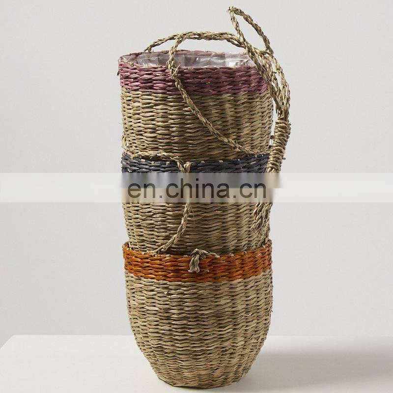 Best Seller 3 Piece Jute & Seagrass Hanging Planter Set With Lining Straw Planter Storage Basket Plant Holder Wholesale