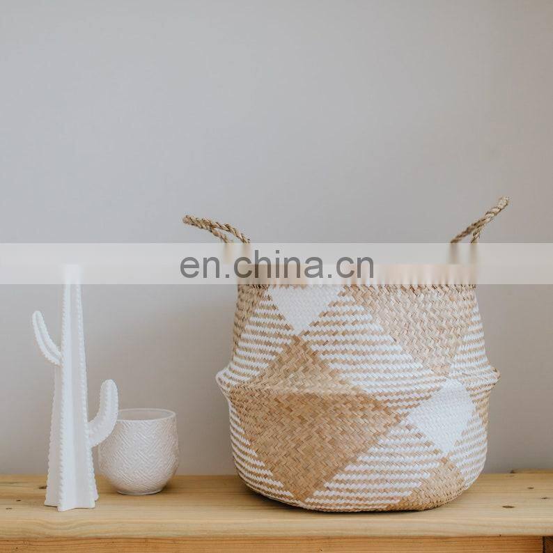 Hand Painted Seagrass Belly Basket Eco Friendly Straw Plant Holder Storage Basket Decor Vietnam Manufacturer