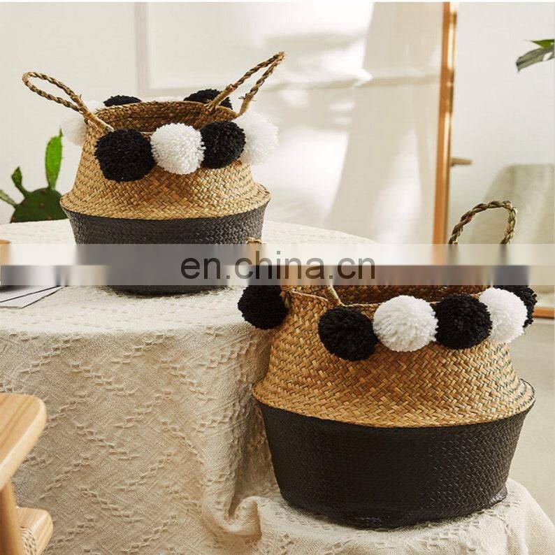 Dipped Black Seagrass Belly Basket With Pompom Plant Holder Storage Basket Decor Home High Quality