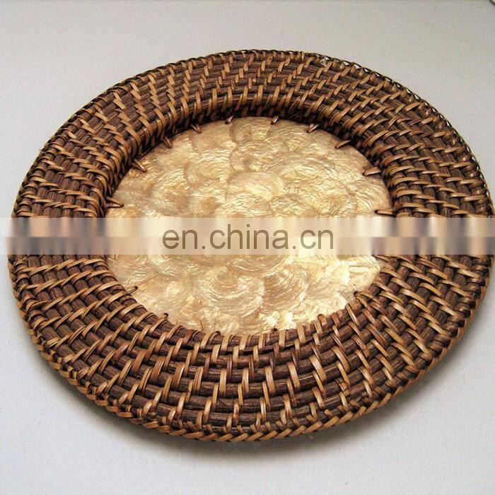 100% Nature Rustic Round Plate for Table Centerpiece, Wicker Rattan Serving Tray With Shell Ornament
