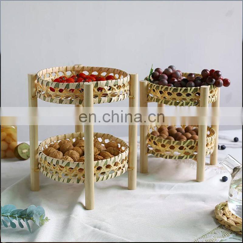 Hand Woven Storage Basket Round Bamboo Basket With Wooden Leg Double Layer Platter Tray