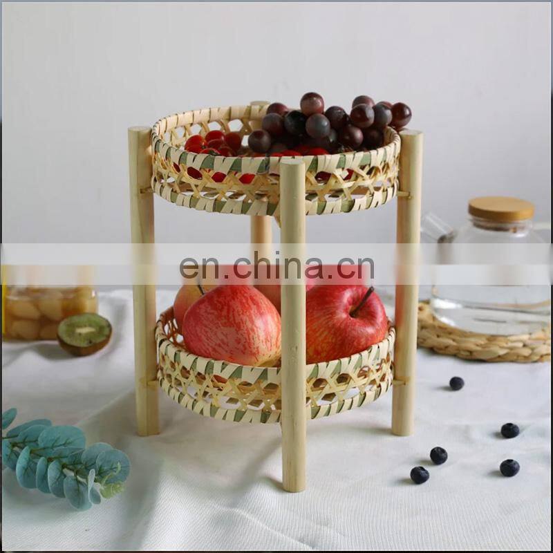 Hand woven storage basket round bamboo basket with wooden leg Double layer platter tray