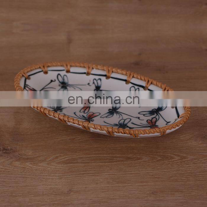 Hot Sale Factory Wholesale Vietnam Rattan Ceramic Fruit Plate Japanese Living Room Household Snack Tray Wholesale