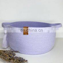 Home Decor Lavender Color Storage Basket, Round Decorative Basket With Handles. Cotton Rope Basket for Storage and Organization