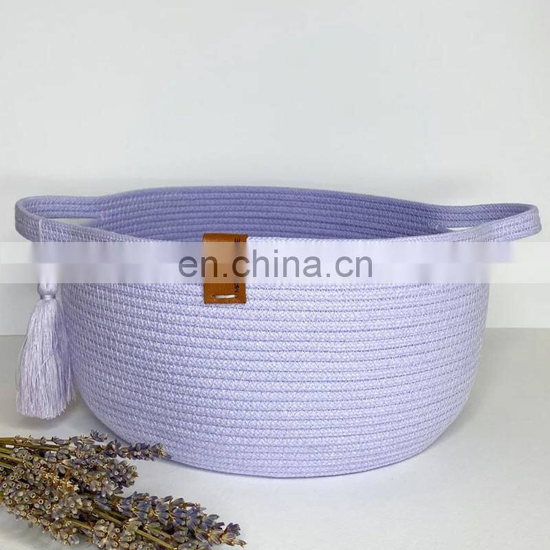 Home Decor Lavender color storage basket, round decorative basket with handles. Cotton rope basket for storage and organization